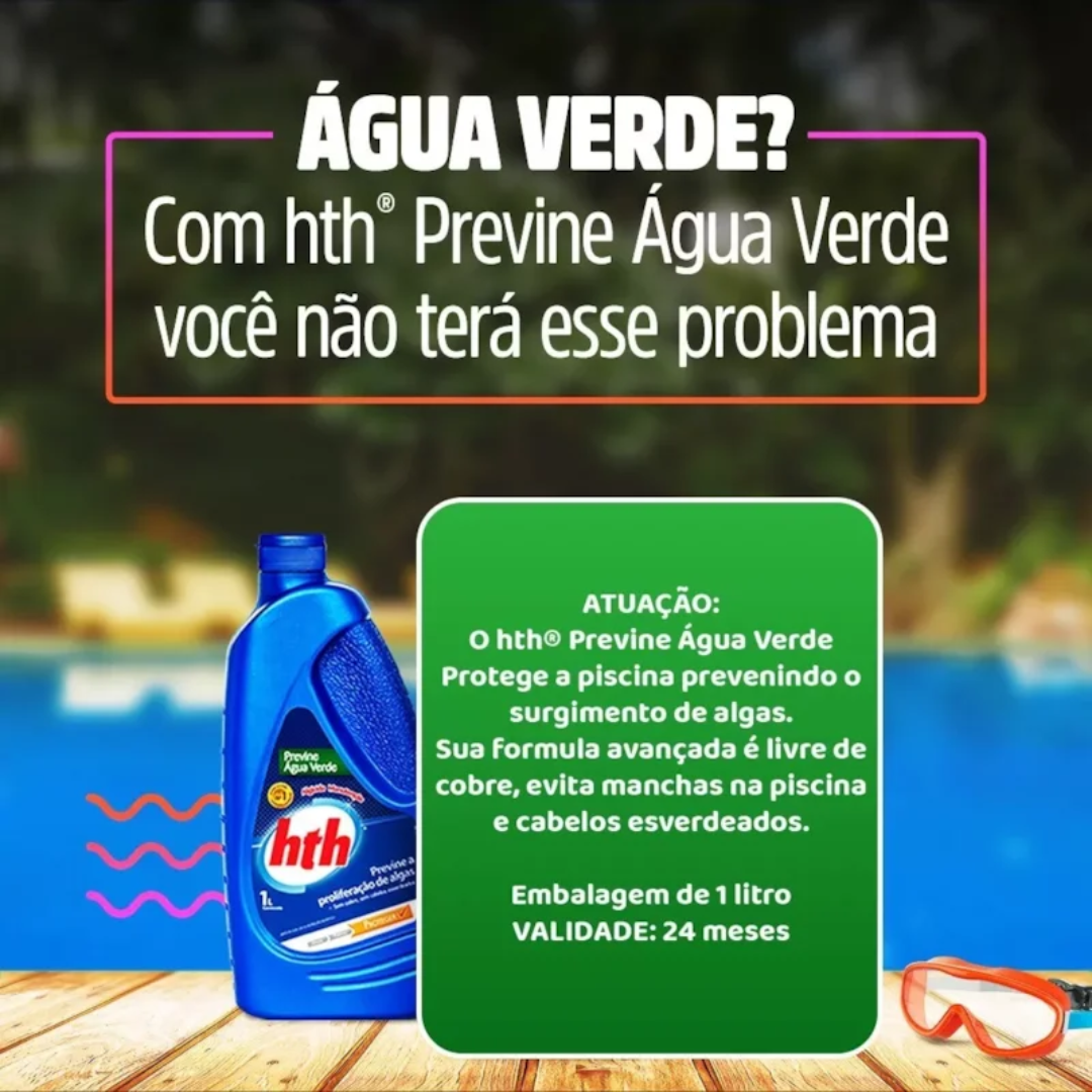 O Algicida Manutenção HTH Previne Água Verde ajuda a prevenir o surgimento e a proliferação de algas, protegendo a piscina contra a água esverdeada e mantendo o aspecto limpo por mais tempo. É indicado para piscinas de fibra, vinil e azulejo, como parte da rotina semanal de tratamento.
