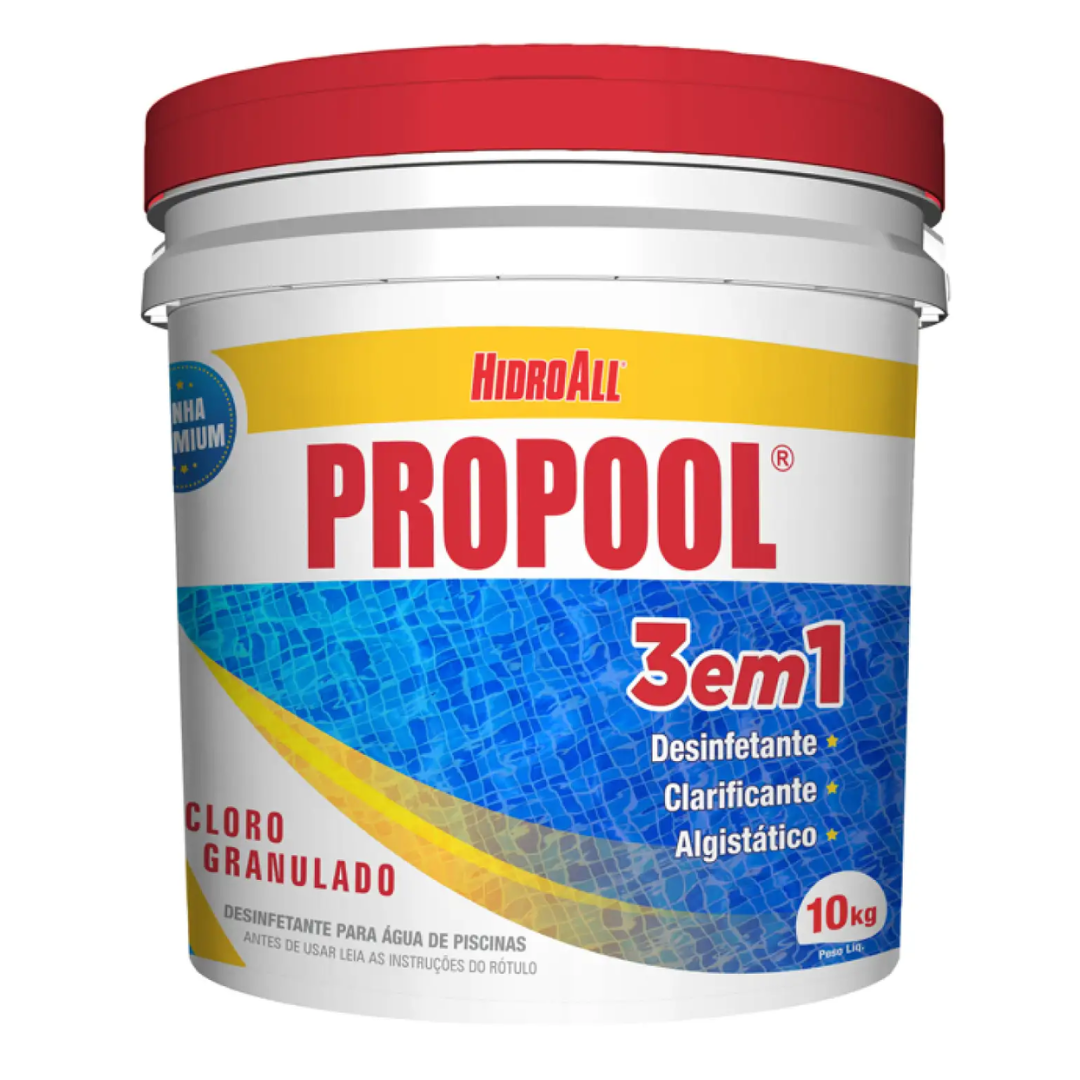 O Cloro Granulado Estabilizado 3 em 1 Hidroall Propool 10kg oferece um tratamento prático para manter a piscina sempre bem cuidada, reunindo ação desinfetante (bactericida), algistática e clarificante em um único produto. Sua fórmula com estabilizador UV ajuda a prolongar a ação do cloro sob o sol, contribuindo para uma rotina de manutenção mais eficiente e econômica.